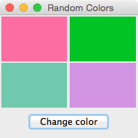 The first example program displays four colored panels at startup, and allows the user to change the colors of the panels by clicking a button. The next two screen shots show the initial window and the result of one button click.