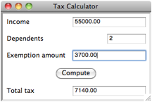The following GUI-based application computes a person’s income tax, based on a mythical tax code having a flat tax rate of 15%.